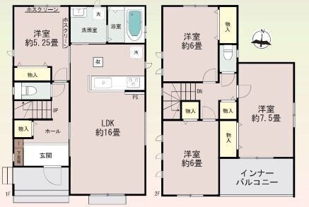 4LDKのバルコニー付きでトイレは1階と2階に一つずつございます。